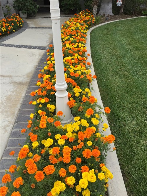Marigolds love warm weather and need full sun to grow well. They can be grown in USDA zones 2 to 11. They look best when planted in groups or mixed with other colorful flowers in containers. Marigolds have a strong scent that helps keep insects away, which is why many gardeners plant them near vegetables.