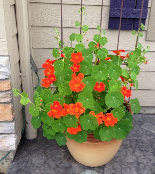 Starting the seeds indoors gives you lots of flowers once the plants are moved outside. Nasturtiums grow well in garden beds and containers. They trail over the edges of pots and look great mixed with other annual plants.