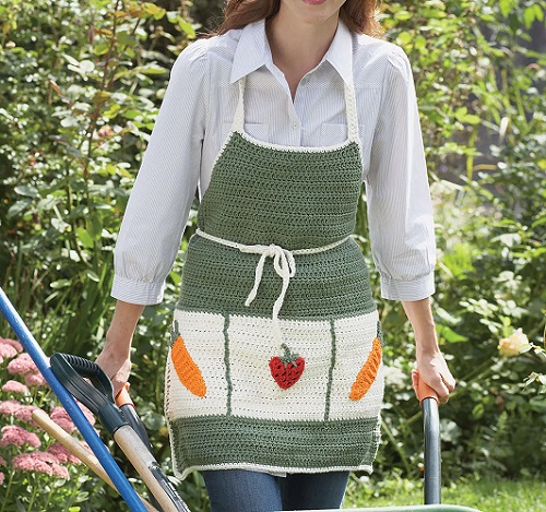 Looking for a proper garden-style crochet apron? Try this Garden Crochet Apron by Yarnspirations, featuring three big pockets with embellished carrots and strawberries, making it an ideal choice. The pattern is traditionally straightforward, and only the embellishments require high focus.