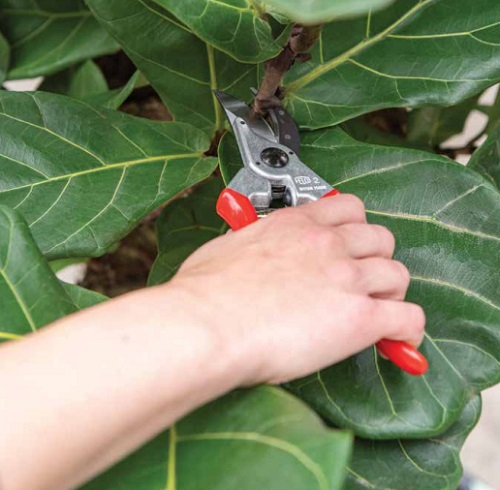 Fiddle leaf figs grow better with a bit of light pruning from time to time. The best time to do this is in late spring or summer when the plant is actively growing. Use clean, sharp pruners and cut at a 45-degree angle between leaf nodes. Be careful not to harm the main trunk or branches.