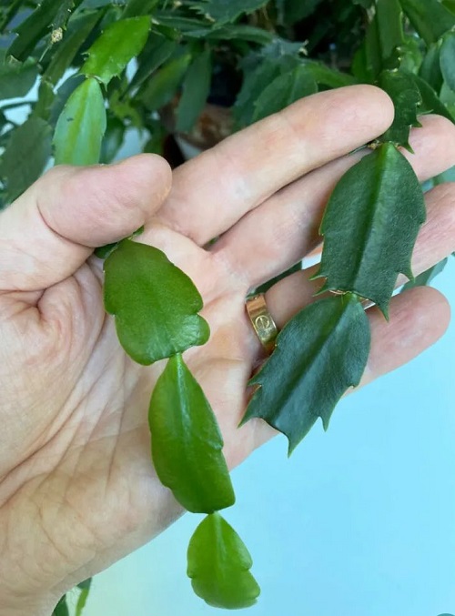 The leaves of Thanksgiving cactus and Christmas cactus are different. Thanksgiving cactus leaves have pointed edges, almost like little claws.