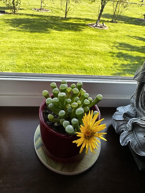 Place Baby Toes (Fenestraria rhopalophylla) in a sunny window and it will bloom regularly. The tips of the leaves are clear and let sunlight pass through. The leaves become wrinkled when the plant needs water. The small “toes” also move slightly and turn toward the light during the day.