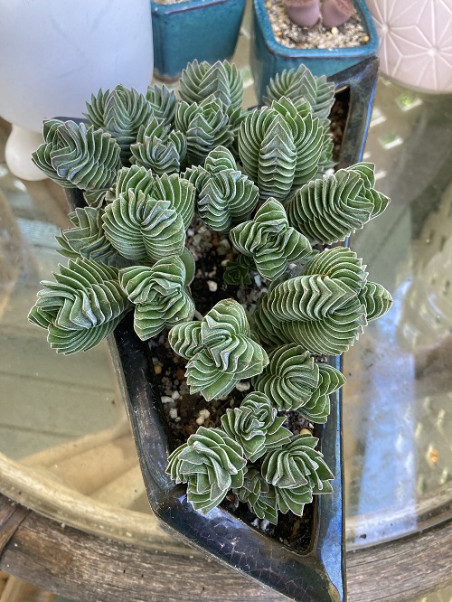 Crassula ‘Buddha’s Temple’ has stacked leaves that form a tall, square column. The shape looks structured and clean. It grows slowly and does not need much space. Keep it in bright light to maintain its form. Use well-draining soil and avoid overwatering. Too much moisture can cause the base to soften. This plant prefers warm and dry indoor conditions.