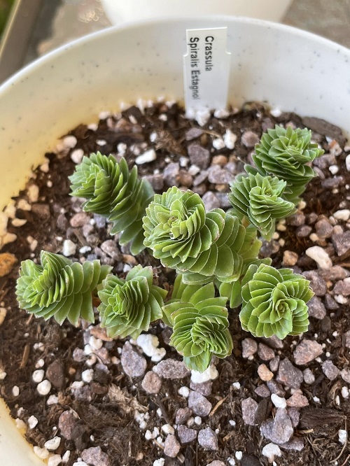 The spiral leaves of the Crassula ‘Estagnol’ make it a very eye-catching succulent. It grows slowly, but over time the stems branch out into several tips. It can also produce small white flowers. Even though it looks different, this plant is related to the common jade plant.