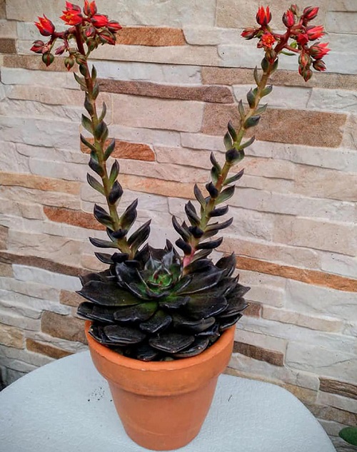 Echeveria ‘Black Prince’ forms a tight rosette with dark, deep-colored leaves. The color becomes stronger in bright light. Place it near a window with good light exposure. Without enough light, the plant may stretch and lose its shape. Water only when the soil is dry. Avoid letting water sit in the rosette, as it can cause rot.
