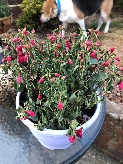 When a fuchsia does not get enough water, it will wilt to show stress. If this keeps happening, the leaves may turn yellow. The tips of the leaves can become dry and brown. The plant may also drop buds or flowers. The good thing is that this problem is easy to fix.