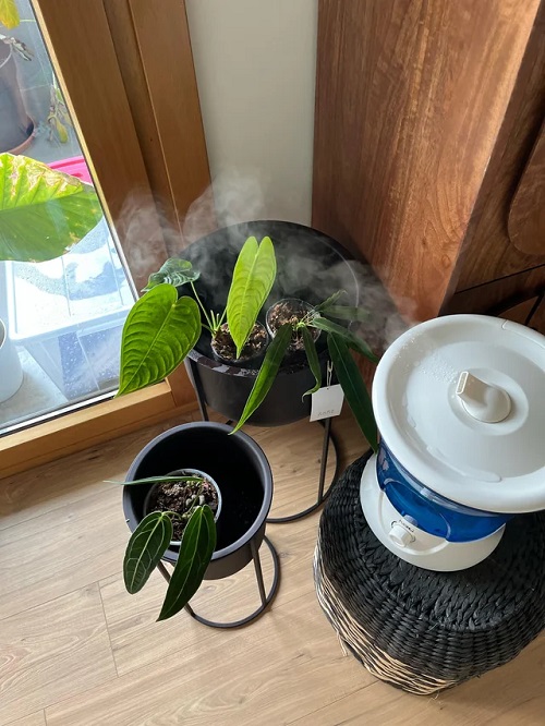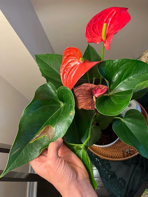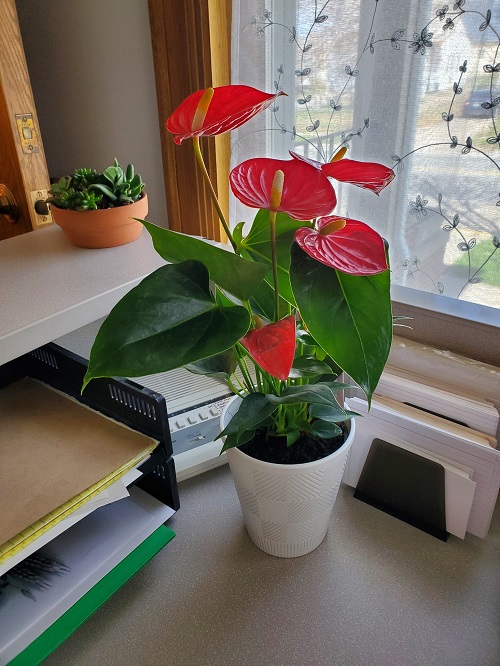 Anthuriums come from tropical areas, so they need high humidity. Dry indoor air makes the leaves brown and the blooms fade. Use a humidifier or place the pot on a tray filled with pebbles and water. You can group plants together, as it also helps. When the air is moist, the plant stays healthy and blooms longer.