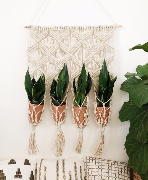 Simply hang snake plants in macrame holders to bring a stylish look and lift greenery off the ground. It is a space-saving way to decorate walls.