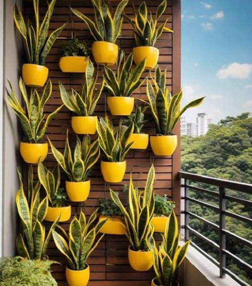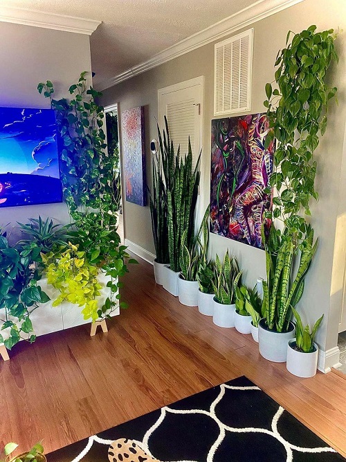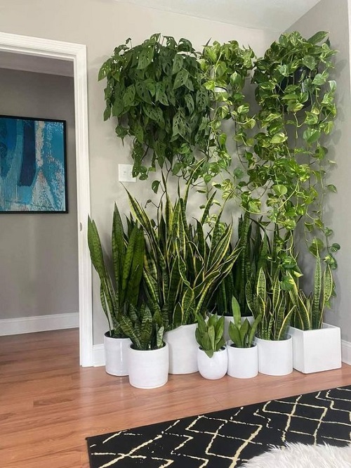 You can surround a wall with groups of snake plants, which softens hard edges and adds freshness. It works well in both modern and traditional spaces.
