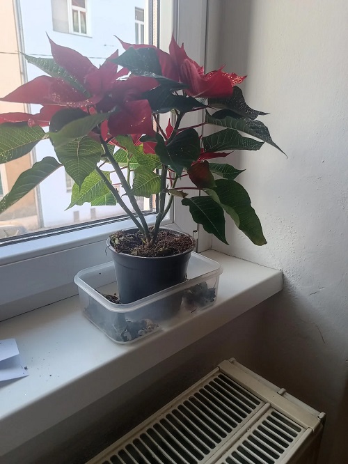 Hot, dry air damages poinsettias just like cold air. Do not place the plant near heaters, radiators, or heating vents. Constant warm air dries the soil too fast. Leaves curl and turn yellow. The colorful bracts fade early. The plant becomes weak and stops growing. Balanced room temperature helps it stay healthy.
