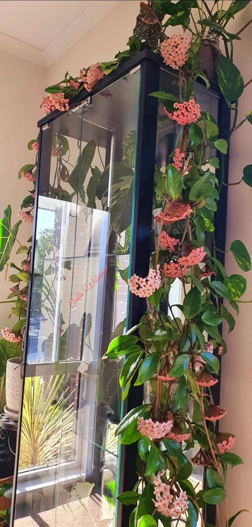 The thick leaves of Hoyas store water. So overwatering slows growth and stops blooms. Water them thoroughly when the top 2-3 inches of soil are dry, then wait before watering again. The trick is to use lukewarm rainwater or aquarium water once a month, as the mild nutrients and natural minerals encourage faster growth of leaves and vines.