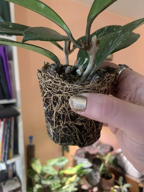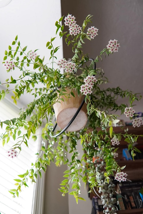 Hoyas bloom better when they are slightly root-bound. Too much space in the pot makes them focus on root growth instead of flowers. So, use a snug pot to keep them root-bound. Repot the wax plant only when the roots circle the pot heavily. Use a clear nursery pot inside a decorative planter. This will let you easily check root growth and prevent over-repotting, which can delay blooming.