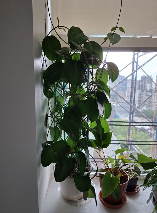 Hoyas are climbers, and supporting their vines will boost growth and flowering. The best support for them is a trellis, a hoop, and a moss pole. Train the vines upward instead of letting them hang, as upright growth encourages stronger vines and more flower nodes.